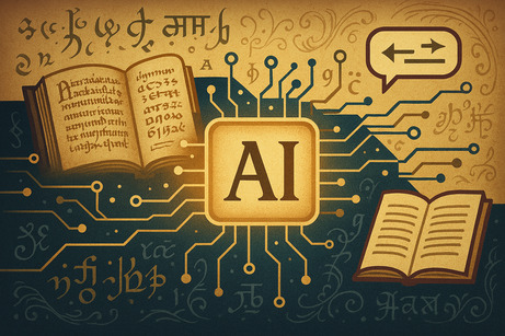 作成プロンプト:「AIが、いわゆる『デジタル人文学』に高い応用性を持つことを抽象的に表すテクニカルイラストを作成してください。とくに、写本デジタル画像の共有・テキストデータ化や、文献テキストへのアノテーション、多言語翻訳など、文献学に関する応用性を意識してください。あしらうモチーフはおまかせします」
